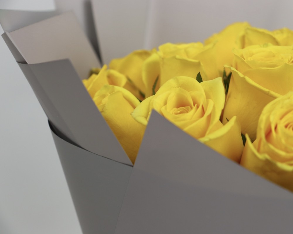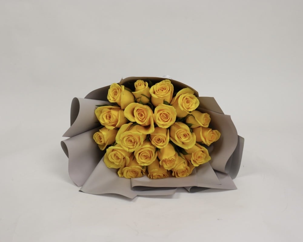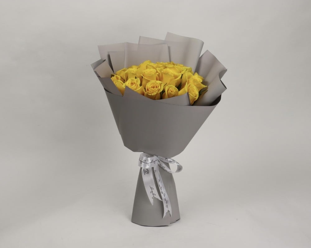 - باقة ورد أصفر مغلفة بورق رمادي أنيق يمنحها مظهراً عصرياً وجذاباً.