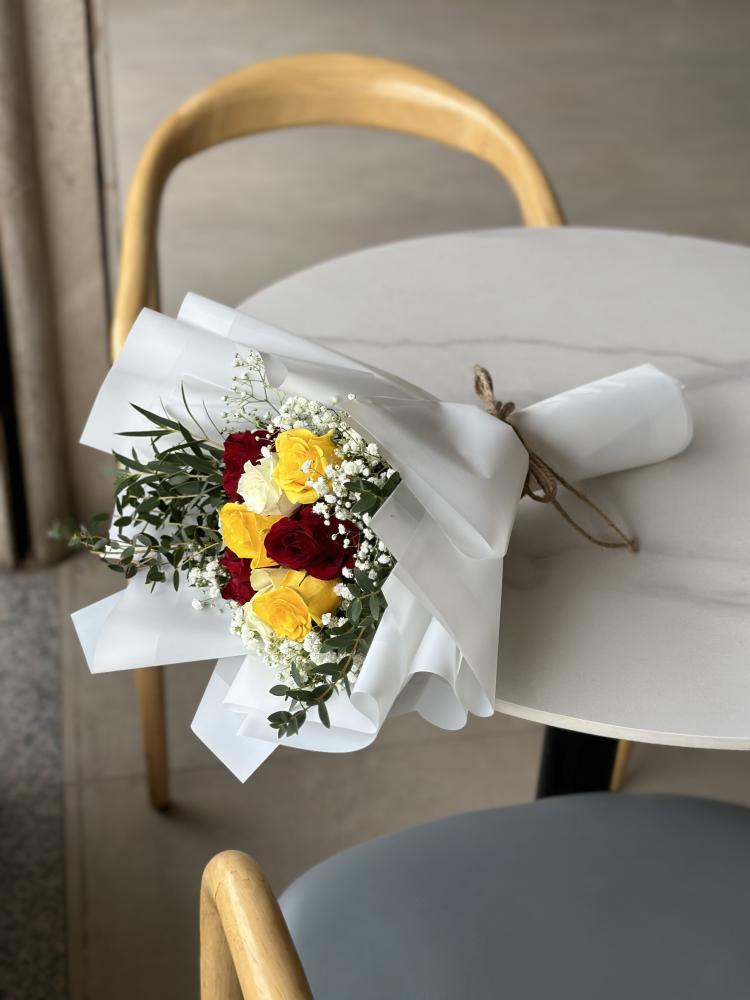 ورد جوري ألوان ألوان يأتى بتنسيق رائع حيث يضم الورد الجوري الأحمر والأصفر مشرق مع لمسات رقيقة من أغصان الجبسوفيليا البيضاء ليكون الاختيار الأفضل للتعبير عن المشاعر الصادقة في جميع المناسبات.