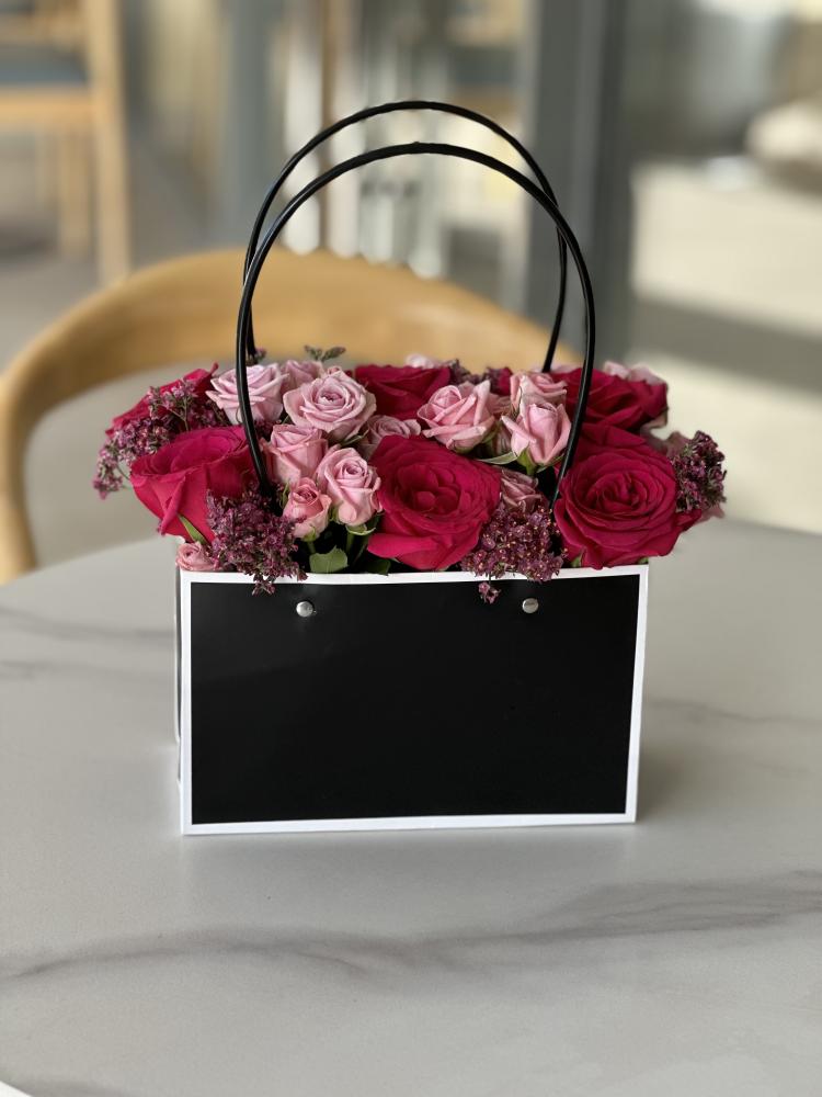 كيس ورد أنيق تعد الإختيار المثالي لمن يبحث عن الأناقة والرقي في هدية استثنائية بتنسيق فريد من الورود الوردية والحمراء داخل حقيبة أنيقة باللون الأسود والأبيض وتضم هذه الباقة مزيجًا من الجمال والجاذبية المثالية لكل المناسبات الخاصة.