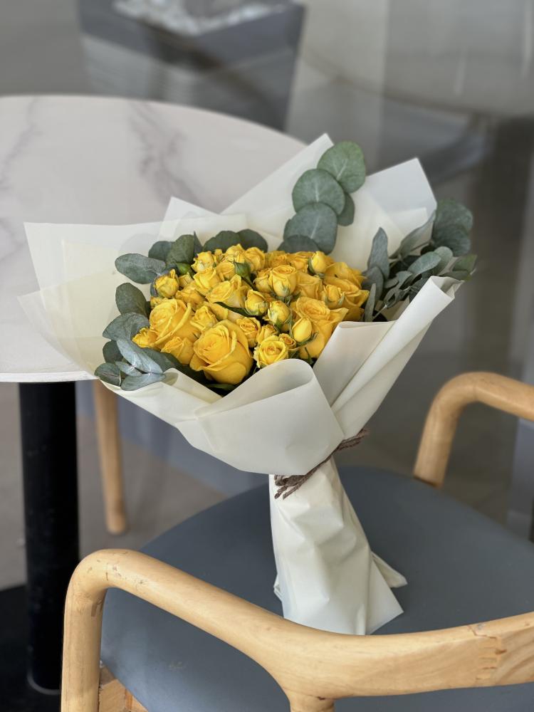 - ورد بيبي روز اصفر تتميز بتنسيق أنيق يجمع بين الورود الصفراء المشرقة والأوراق الخضراء الدافئة.