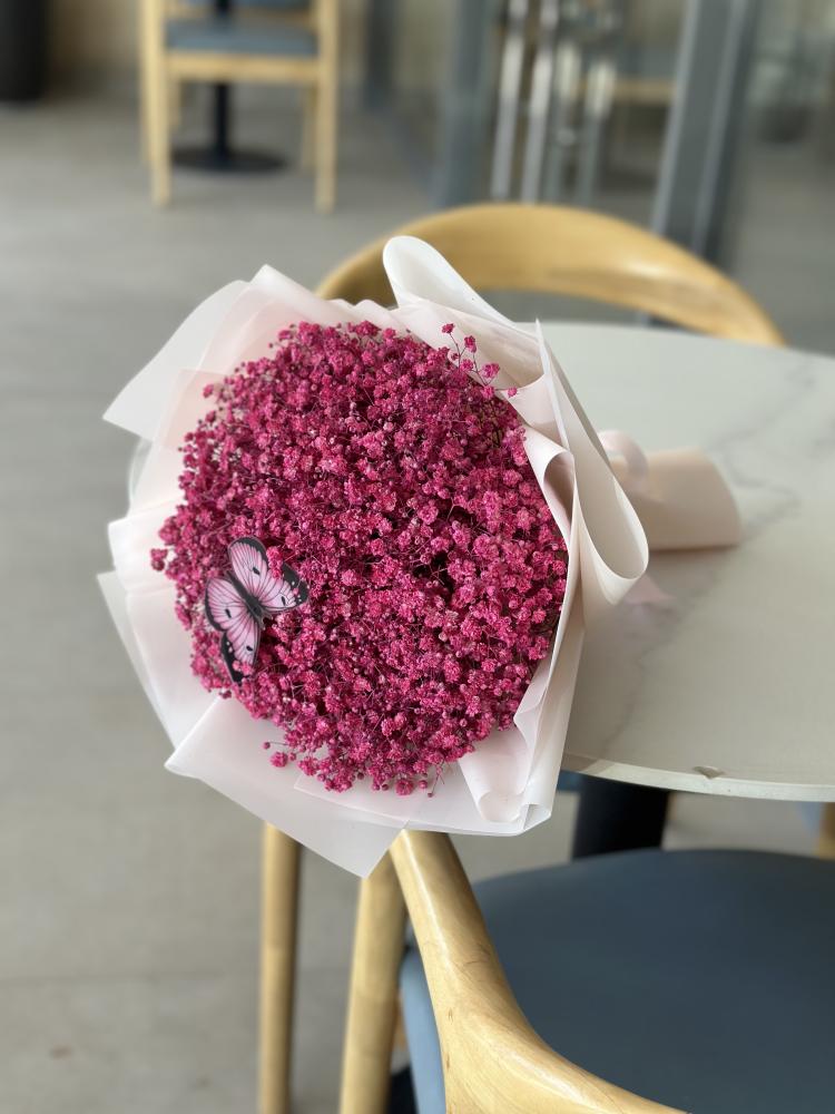 يتميز هذا البوكيه أنه فى منتهى الجمال والرقة حيث يحتوى على ورد الجبسوفيليا الوردي بتنسيق رائع كما أن به فراشة ورقية متناسقة مع البوكيه مما يجعله من الهدايا المميزة لكل من تقدرهم.